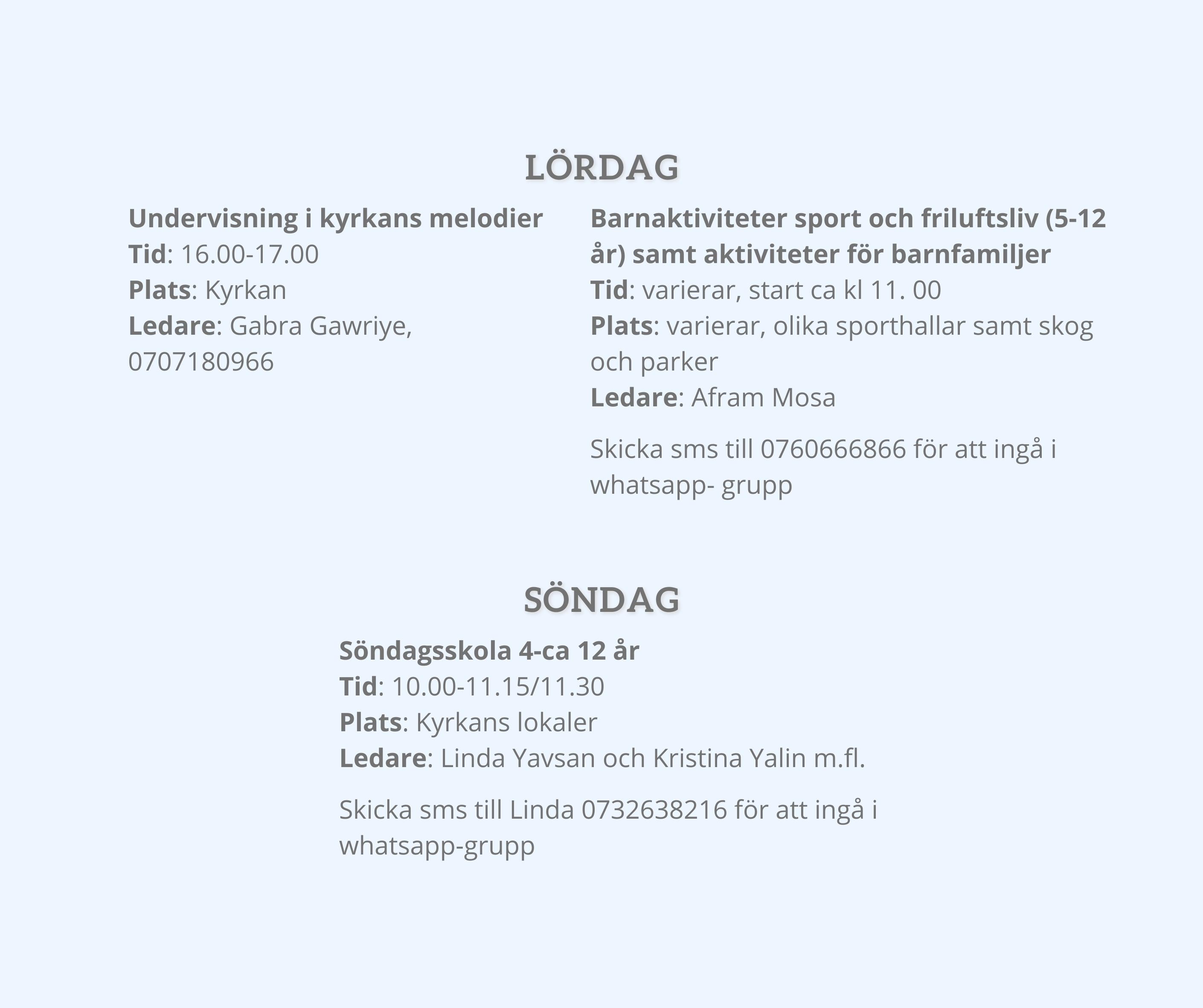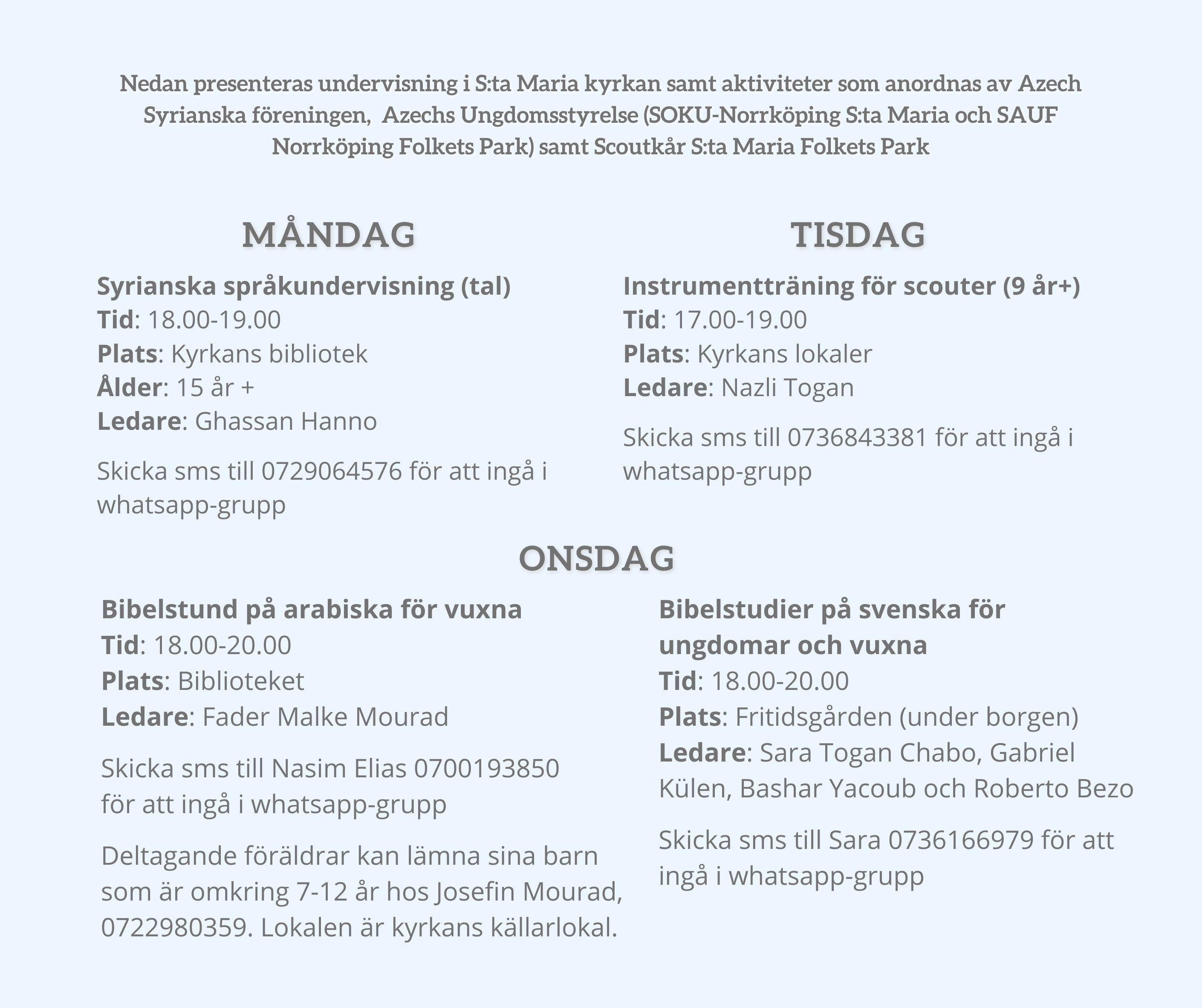 S:ta Marias Syrisk Ortodoxa församling i Norrköping har gudstjänster varje söndag kl. 09.00 i Folkets Park.